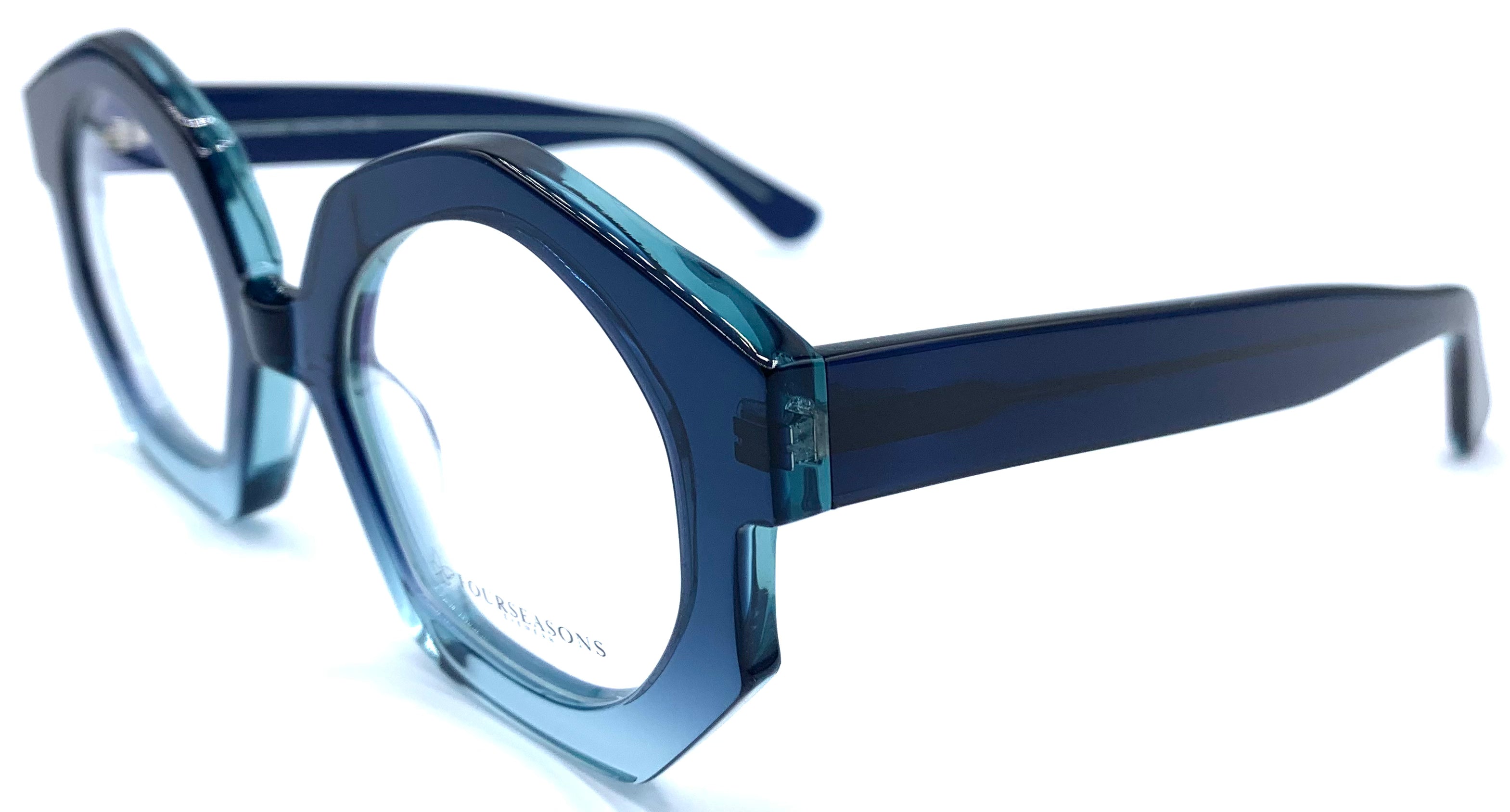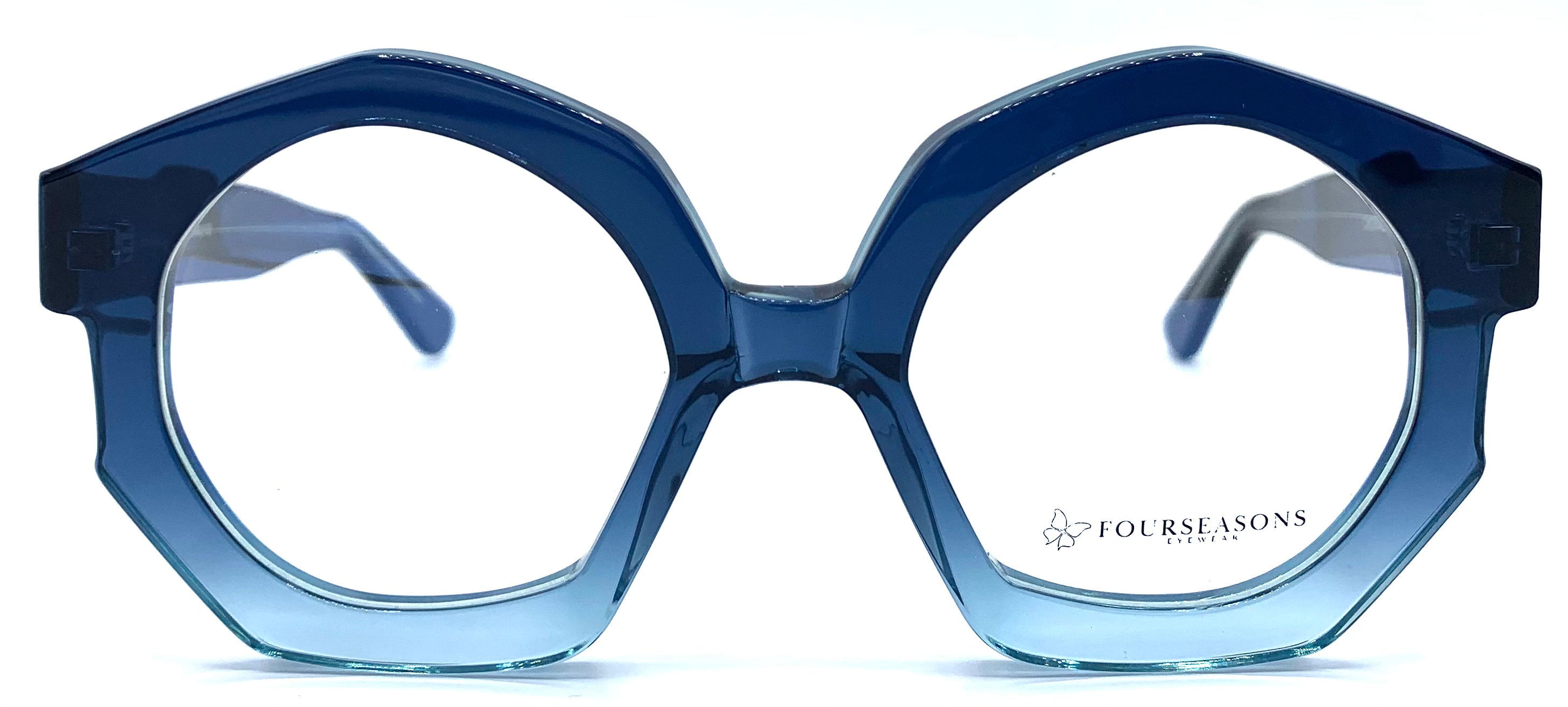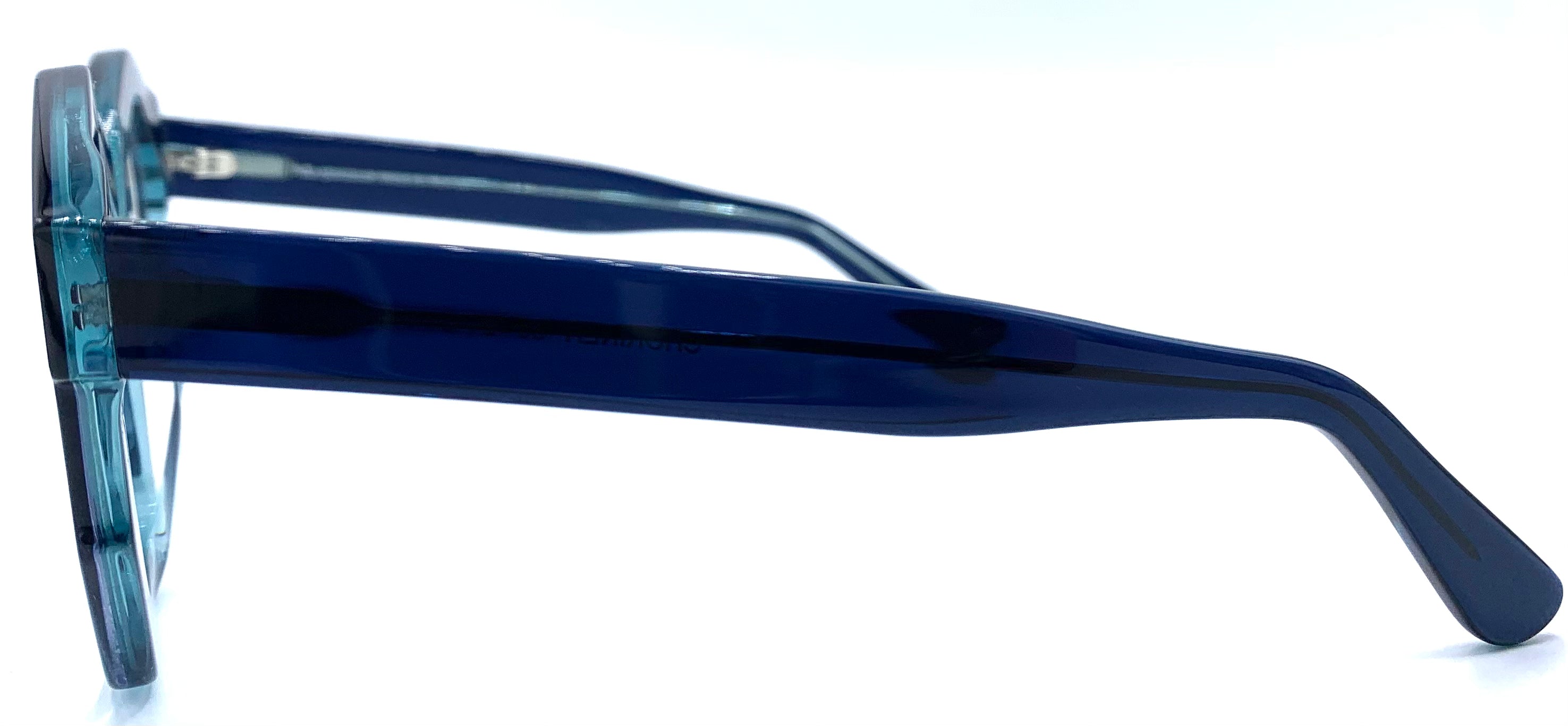 Occhiale da vista donna in lastra spessa con tonalità di azzurro dal trasparente al blu cerniere affogate design stravagante unico