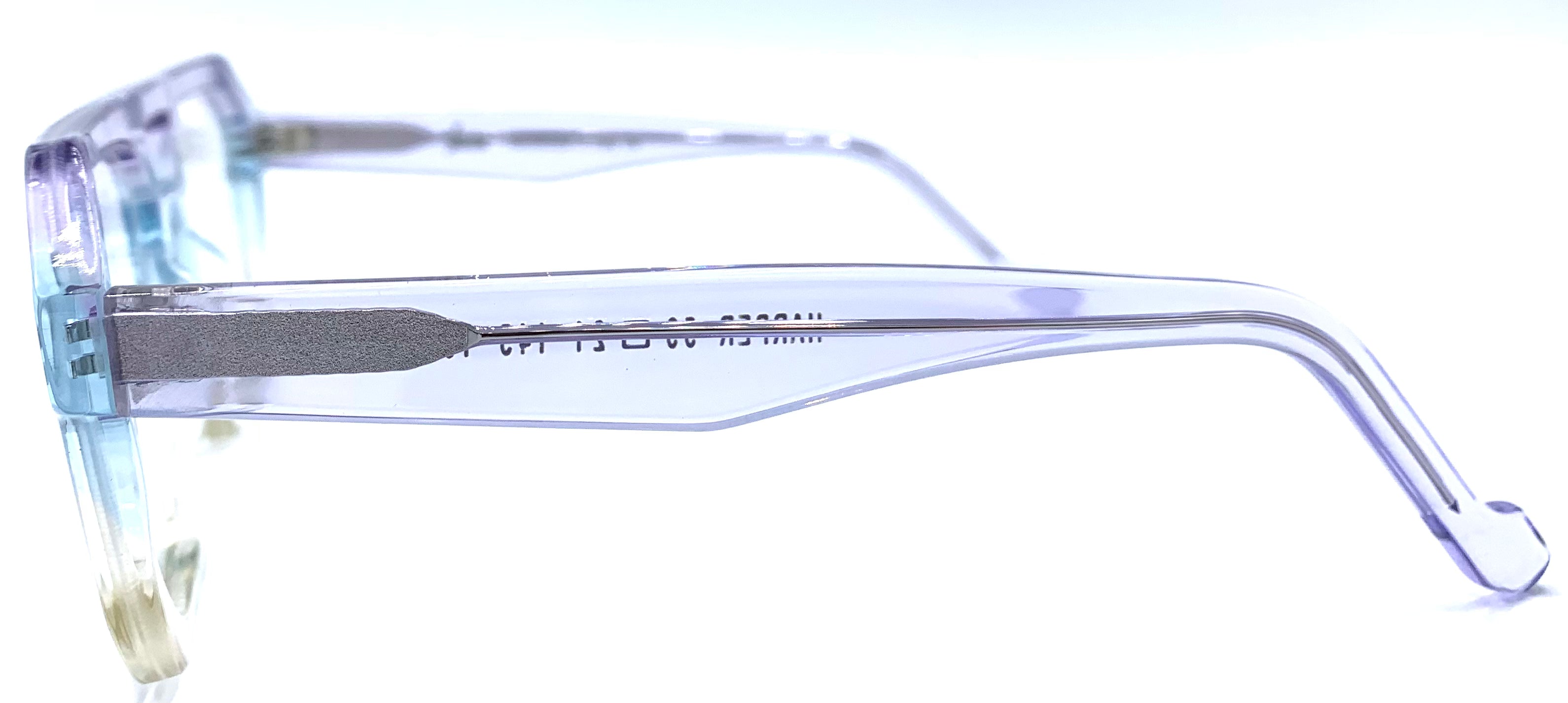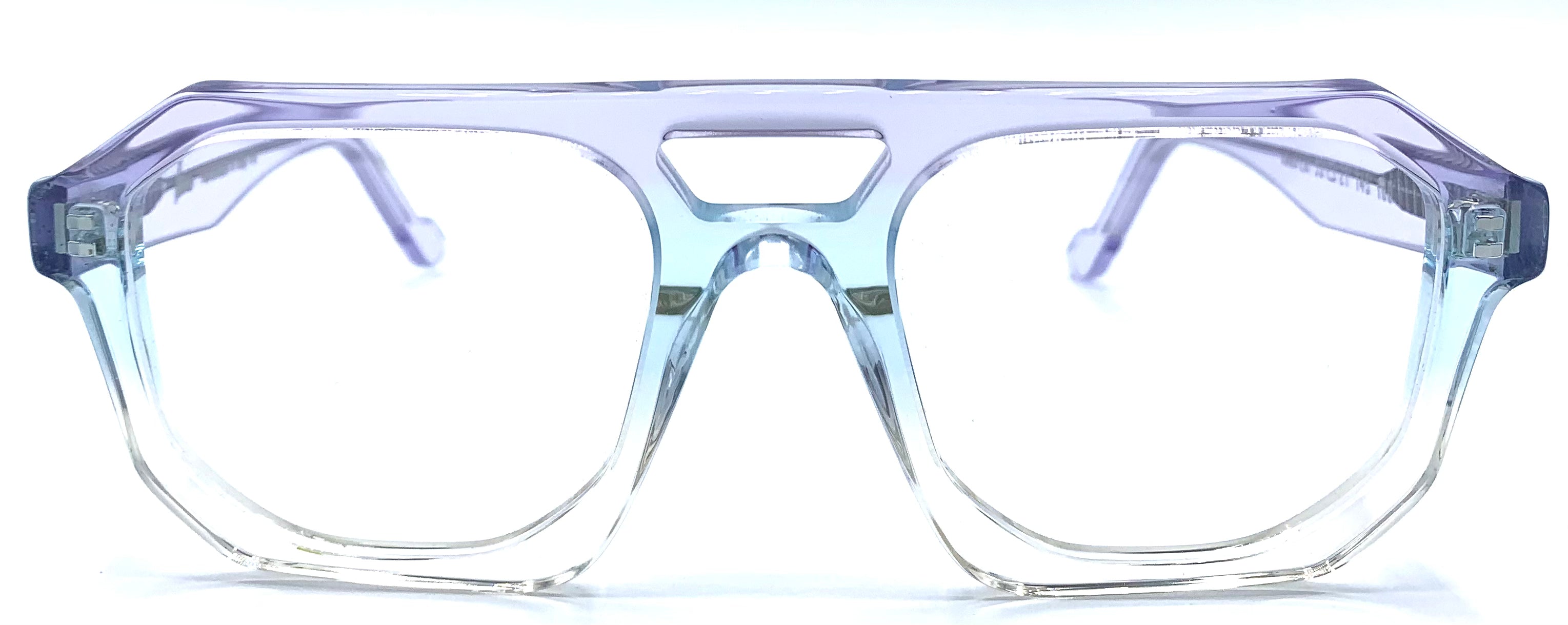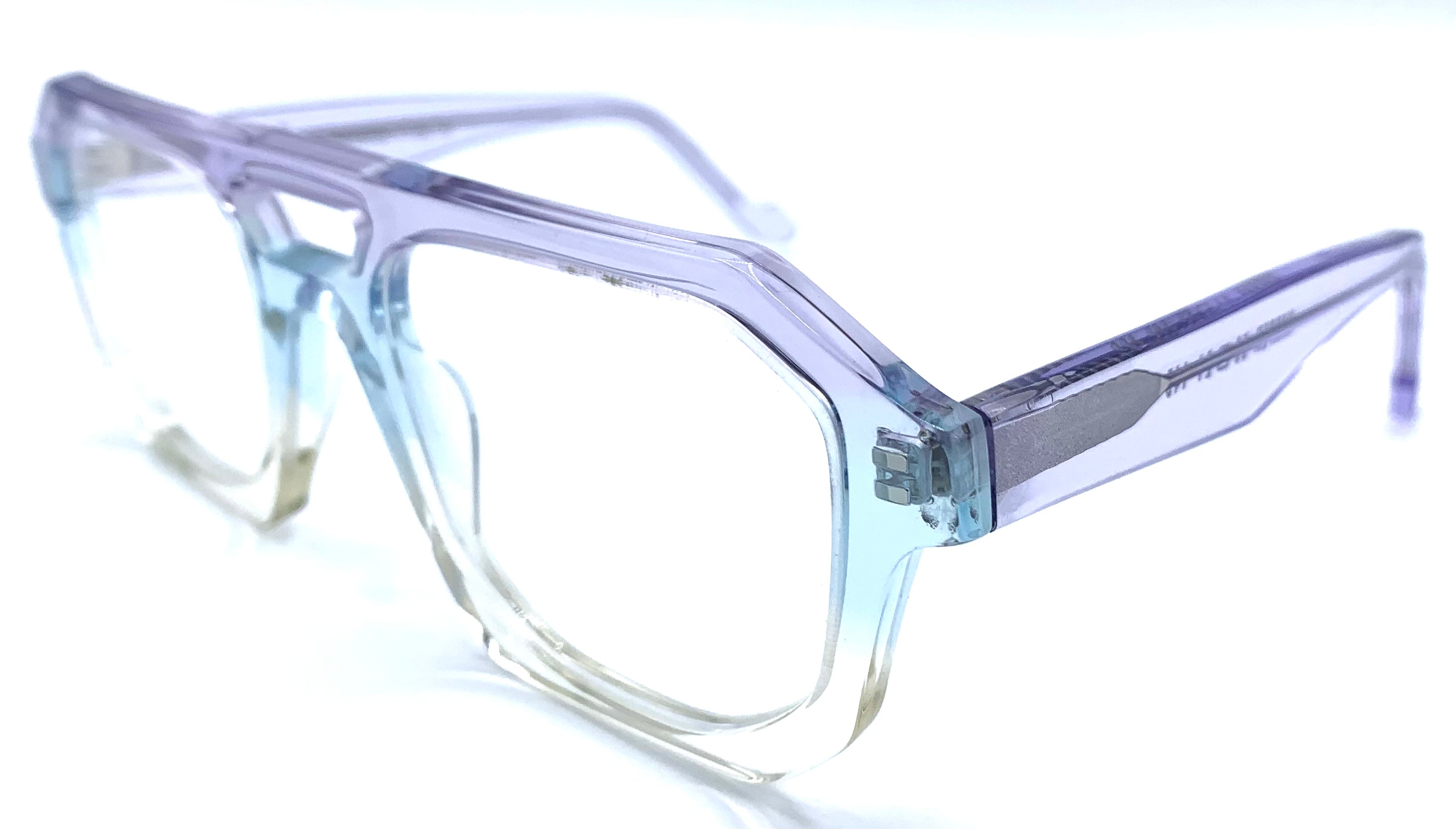 Occhiale da vista unisex in lastra con tre tonalità dal trasparente a violetto cerniere affogate design iconico doppio ponte rettangolare
