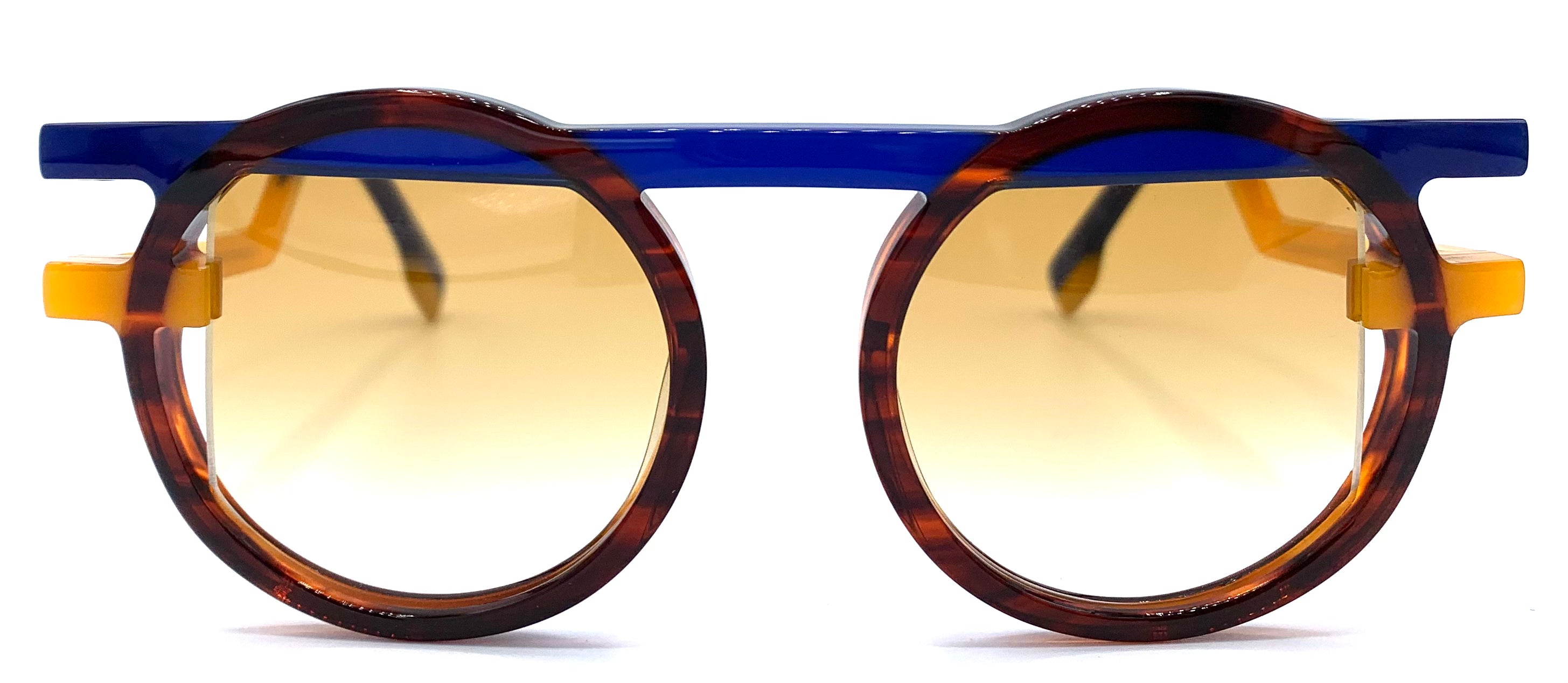 Occhiale da sole unisex in lastra multicolore design stravagante tondo cerniera affogata e aste doppie lenti infrangibili brown sfumati protezione uv
