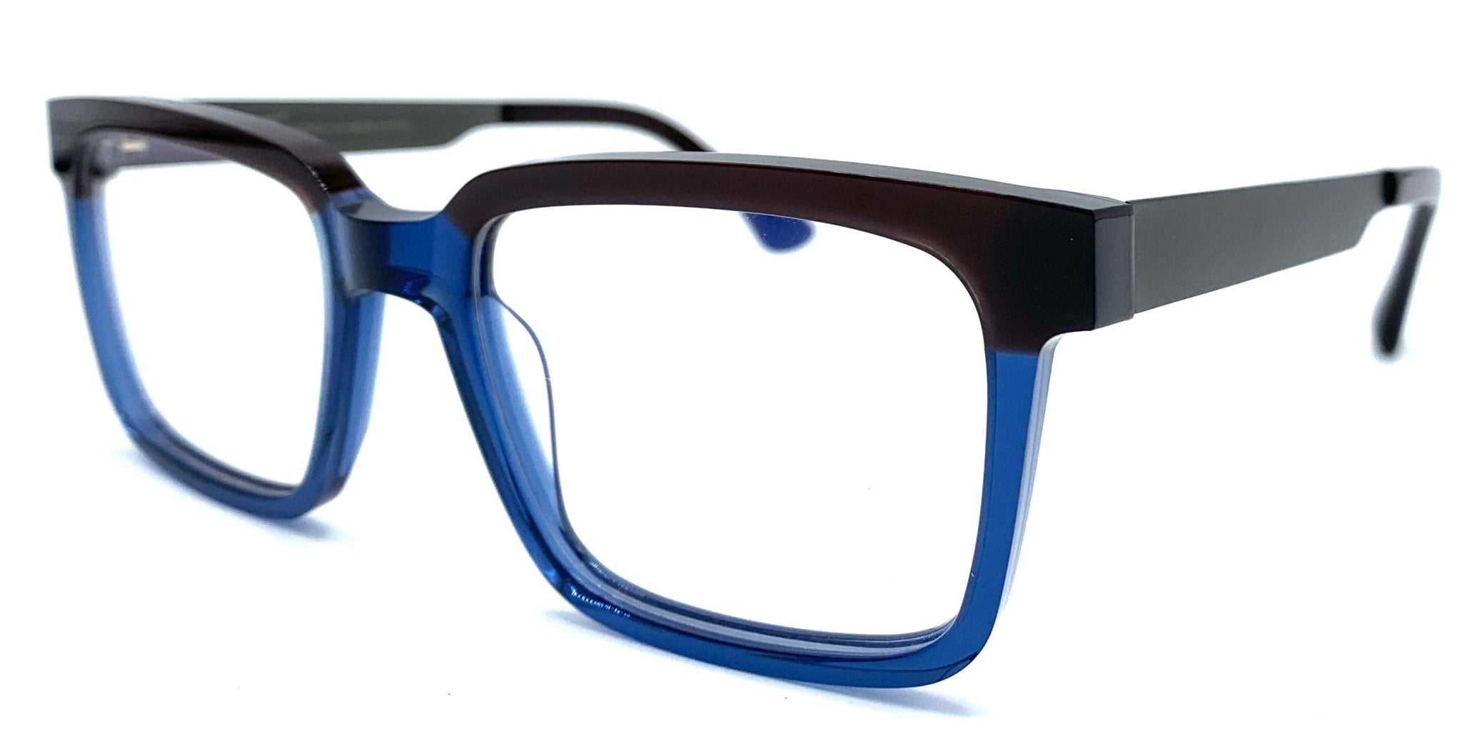 Unisex eyeglasses in two-tone blue plate and shiny brown ciliary rods in satin gray steel