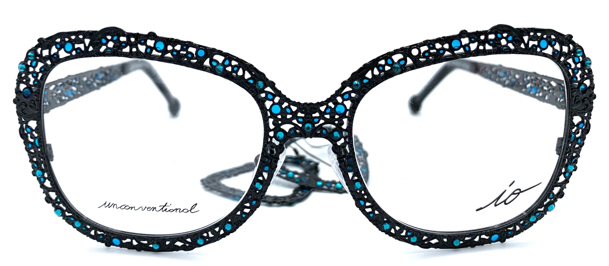 Women's eyeglasses in black anti-Venezia metal, perforated with turquoise Swarovski rhinestones with matching hole earrings with the same material, elegant and light, a work of art