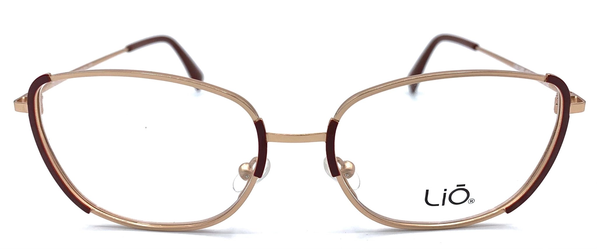 Slightly cat-eye woman's eyeglasses in shiny gold with burgundy edges