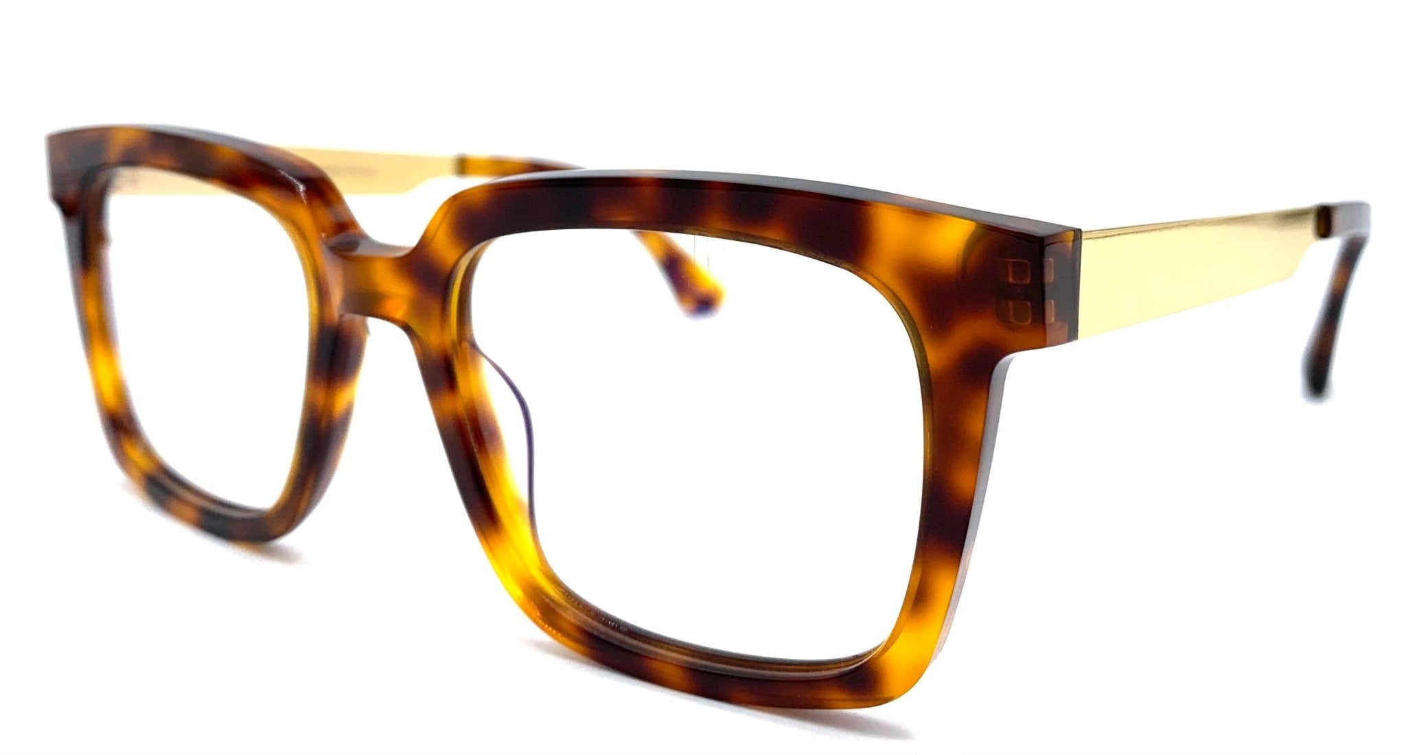 Unisex eyeglasses in speckled brown plate with gold steel temples, large square design