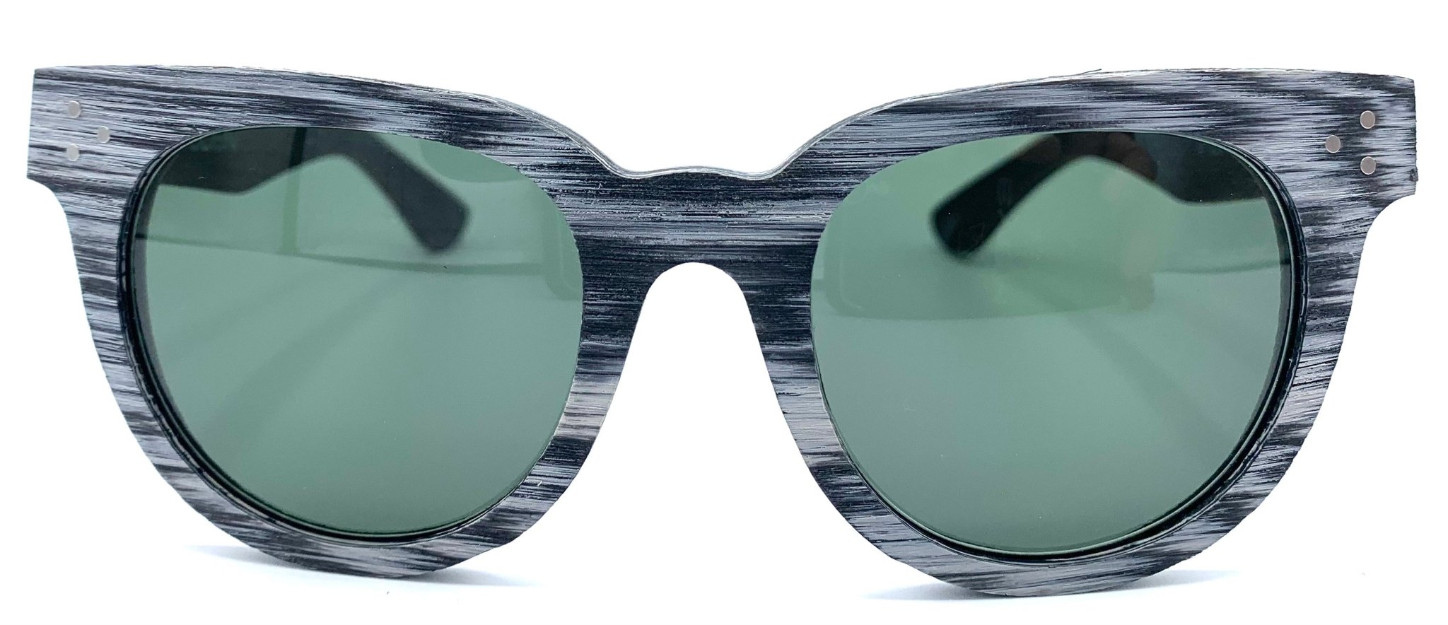 Unisex sunglasses in milled brushed plate with wood effect brown temples with gray and black streaked front the eyewear is not only the effect of wood but also very light.