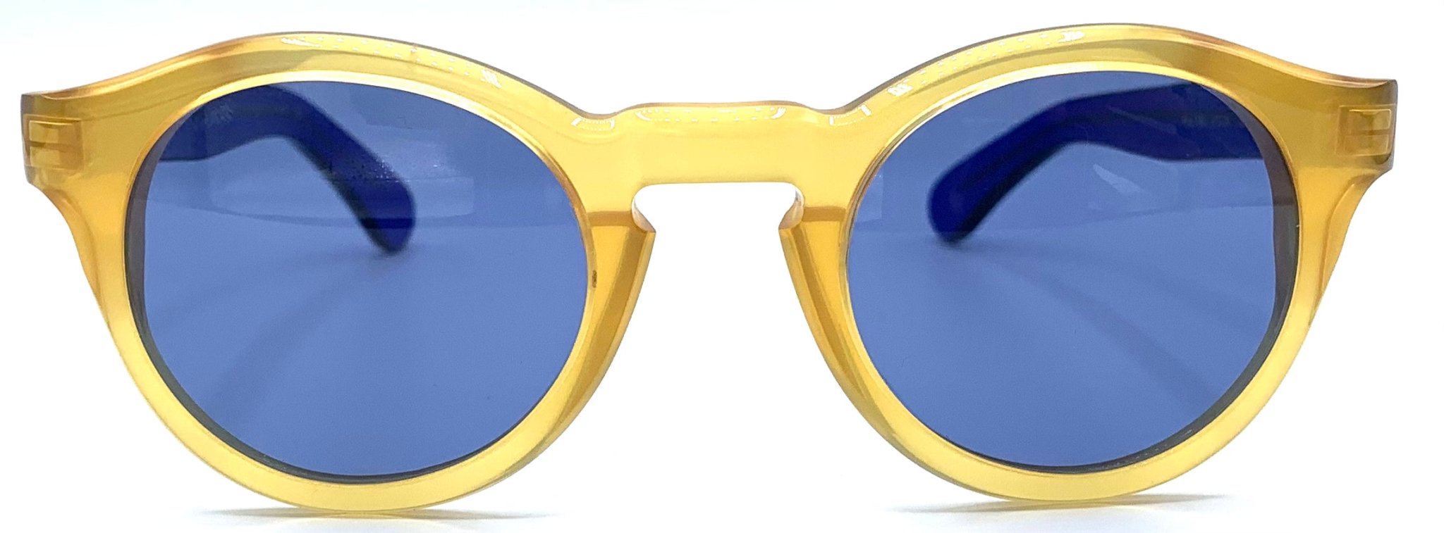 Sunglasses in honey-colored sheet combined with blue sheet temples with Gray UV protection lenses with a unique, modern and refined design.