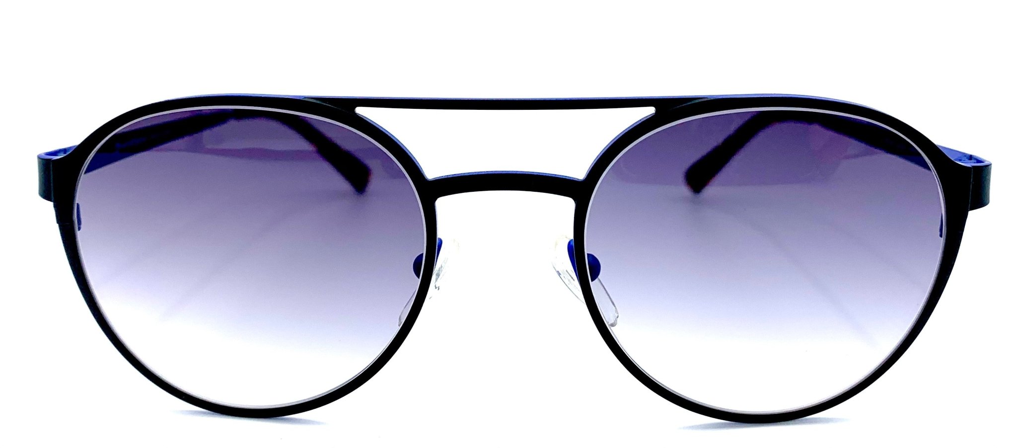 Unisex sunglasses in double black and blue metal with unbreakable Gray shaded UV protection lenses