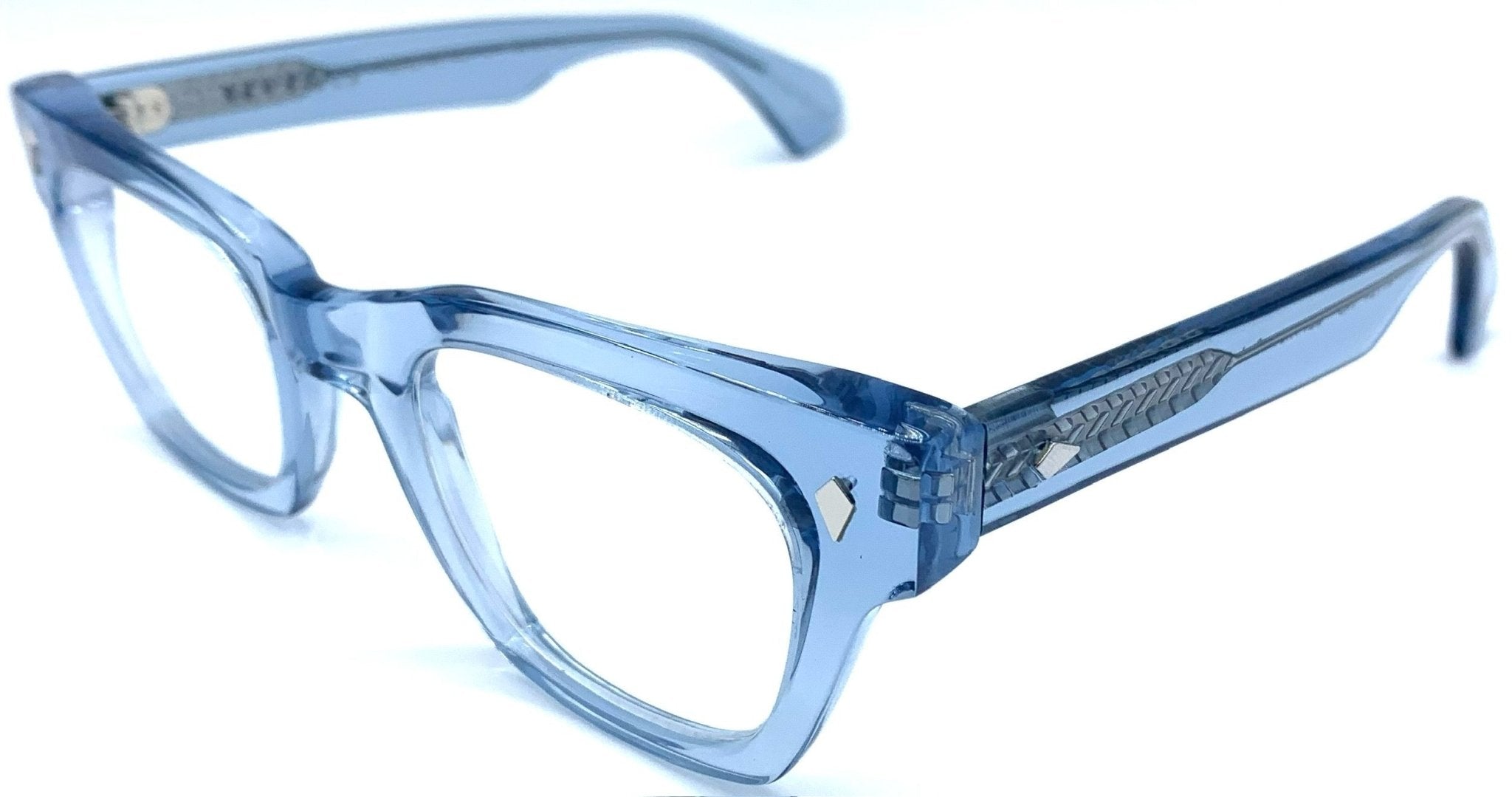 Thick blue plate eyeglasses with silver-coloured hinge inserts and temples