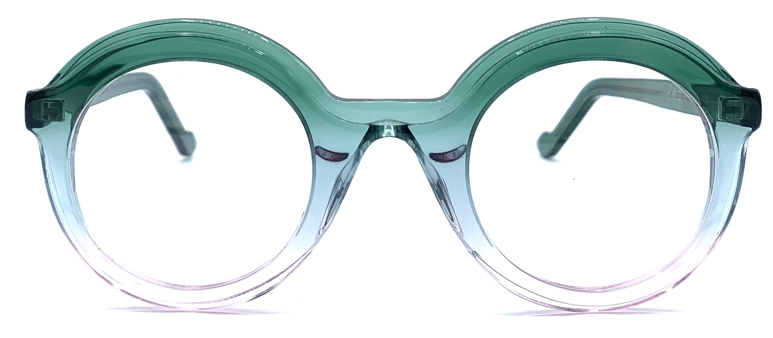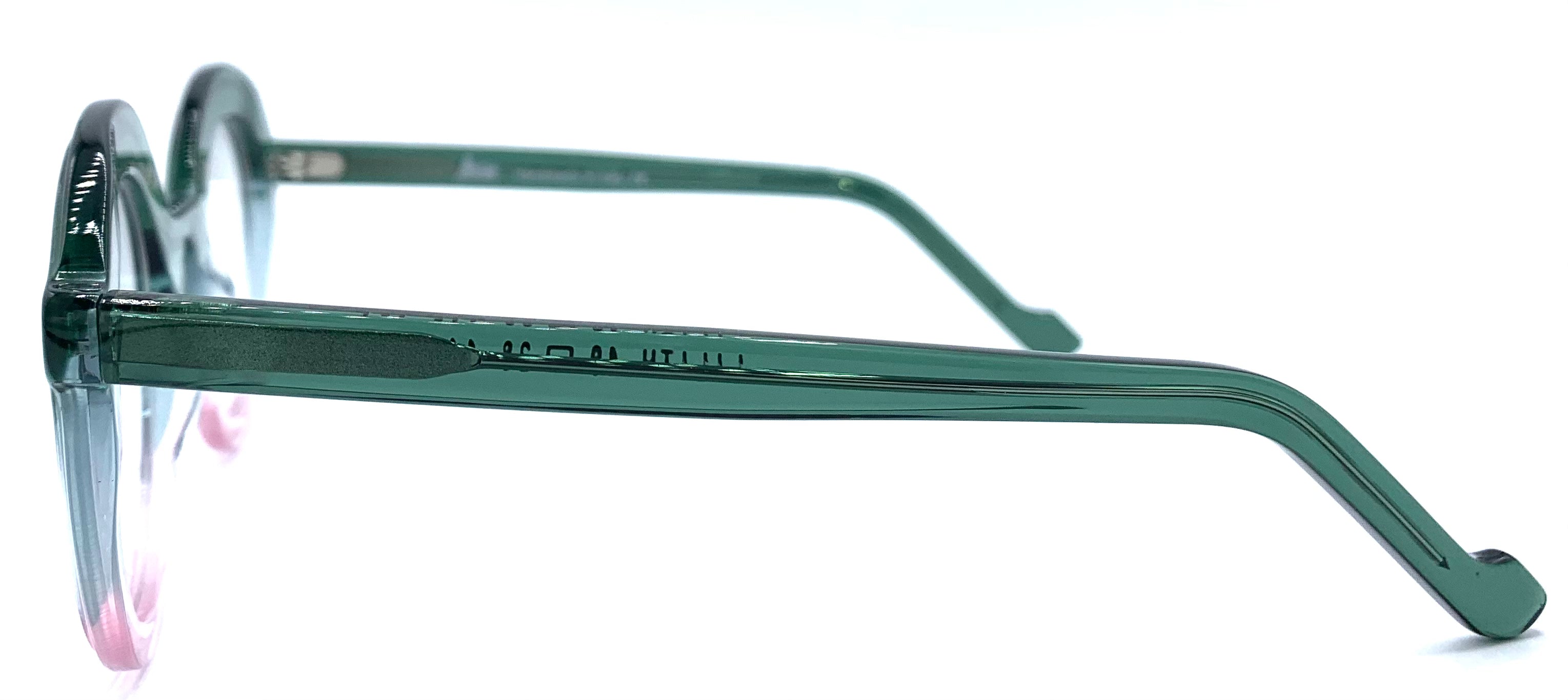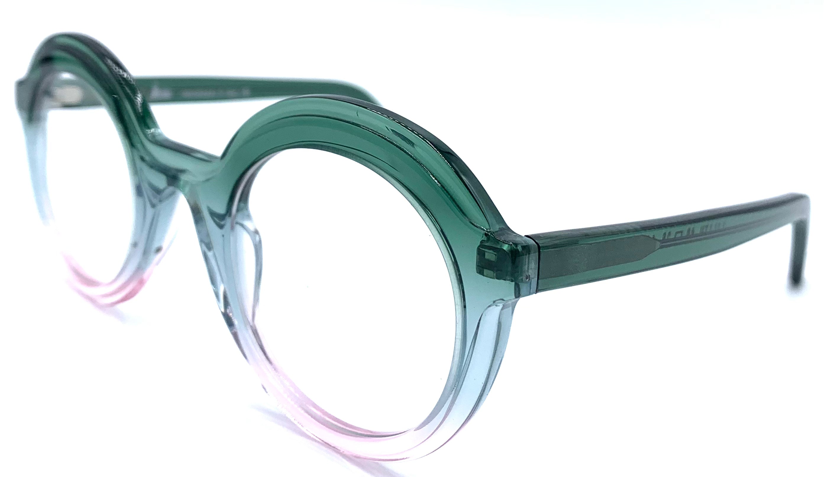 Occhiale da vista donna in lastra bicolore lucida trasparente rosato e verde cerniera affogata design tondo