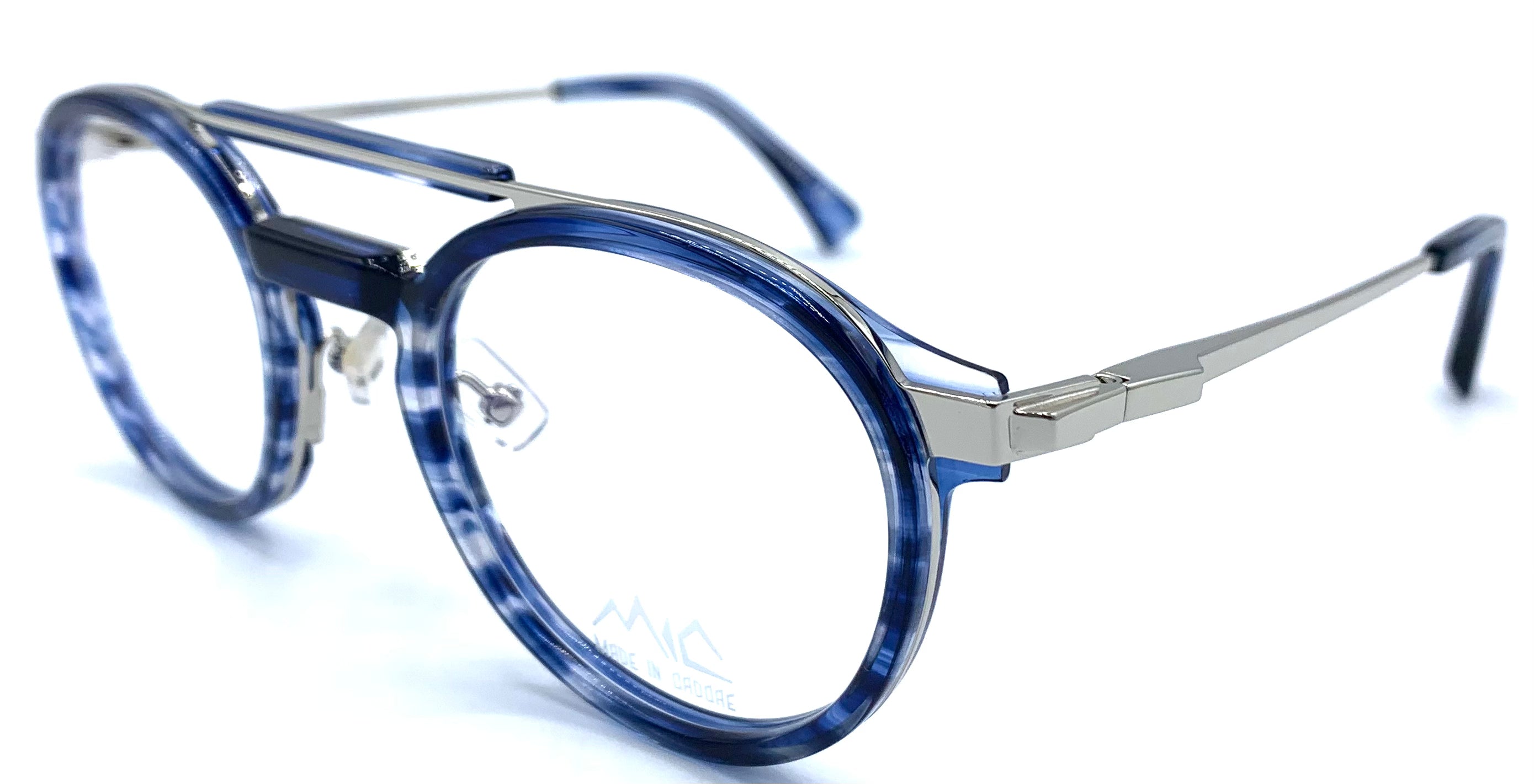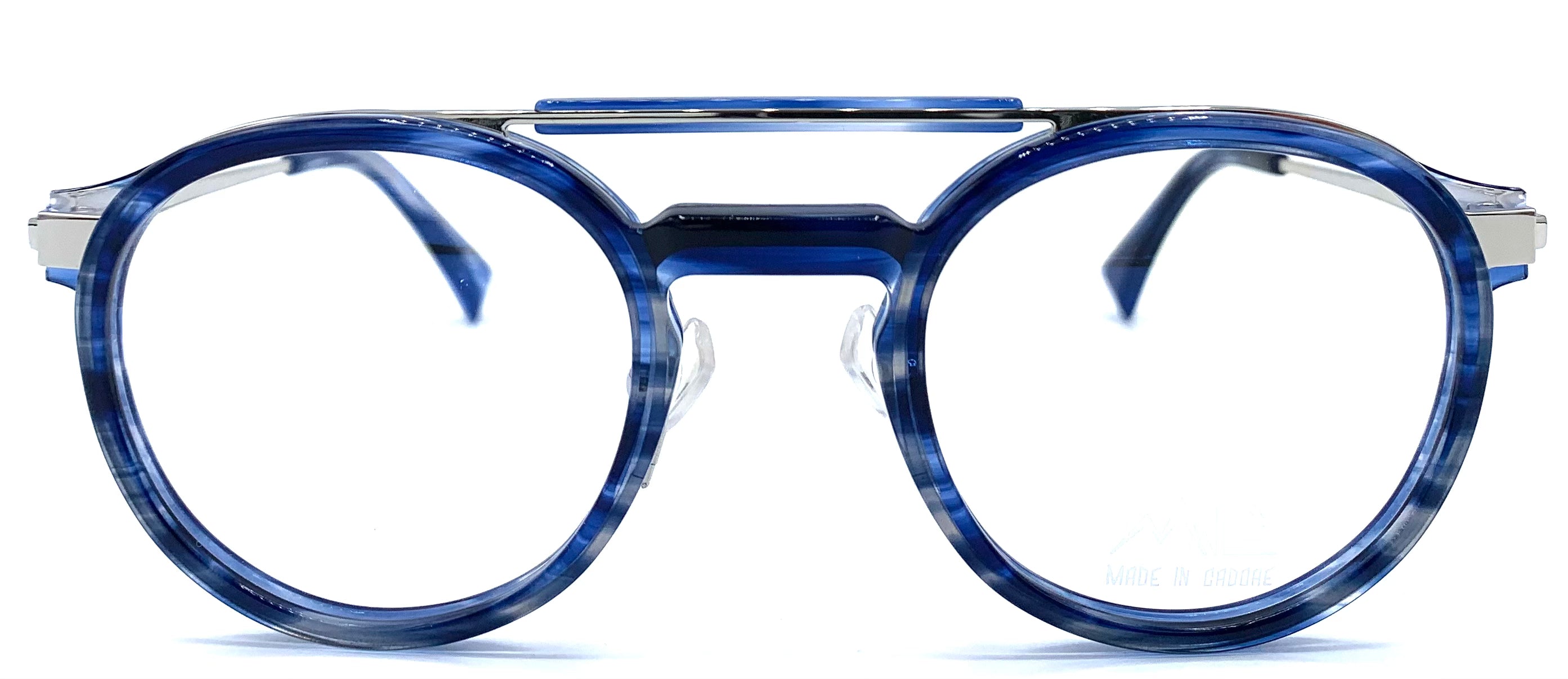 Occhiale da vista unisex combinato metallo argento e lastra blu maculato aste flex design doppio ponte tondo