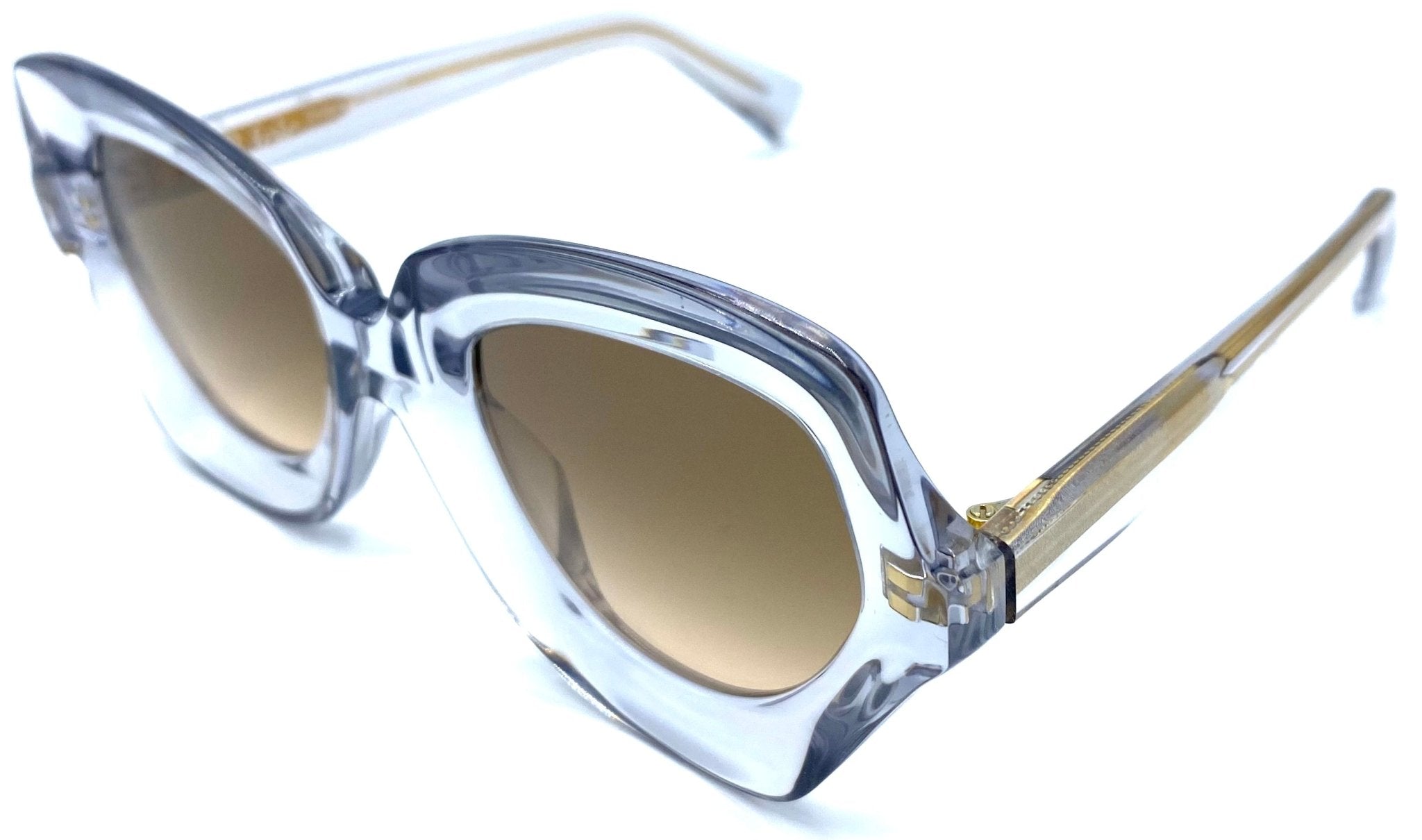 Glasses in transparent colored sheet with a square design with unbreakable brown shaded lenses with UV protection
