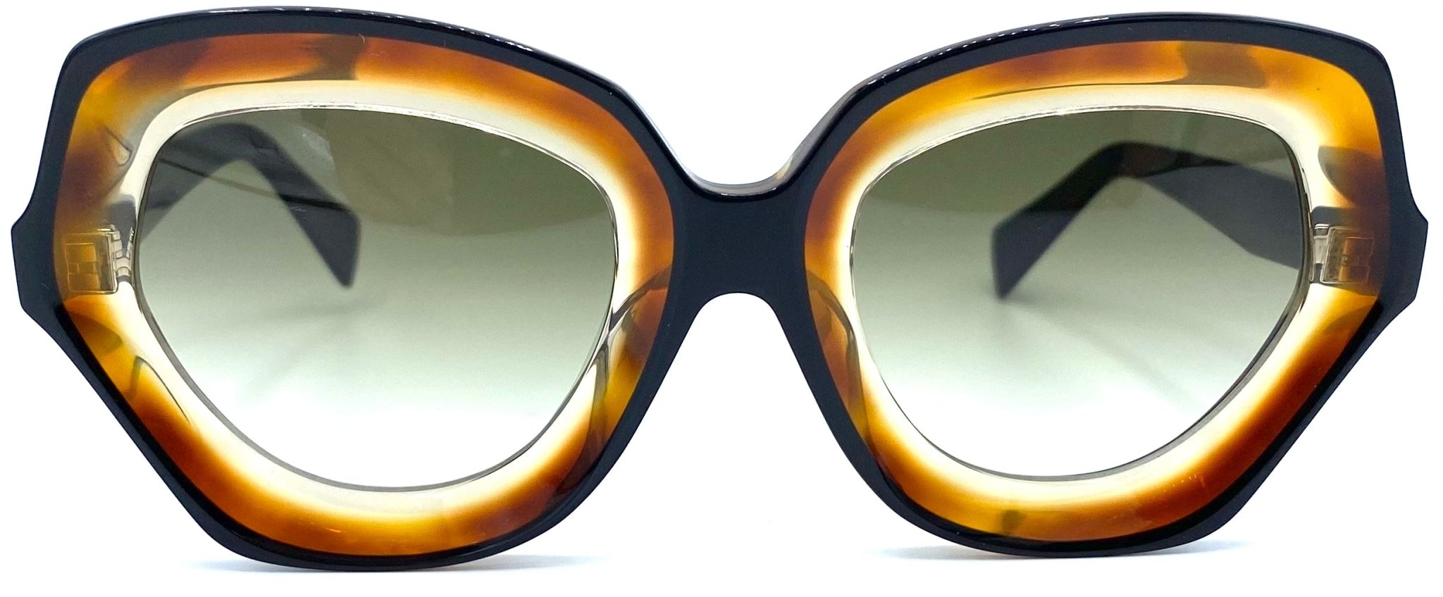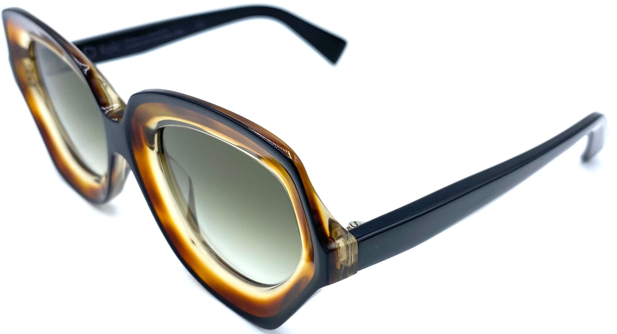 Glasses in honey-coloured sheet that fades into transparent with a black profile with a square design and unbreakable green shaded lenses with UV protection