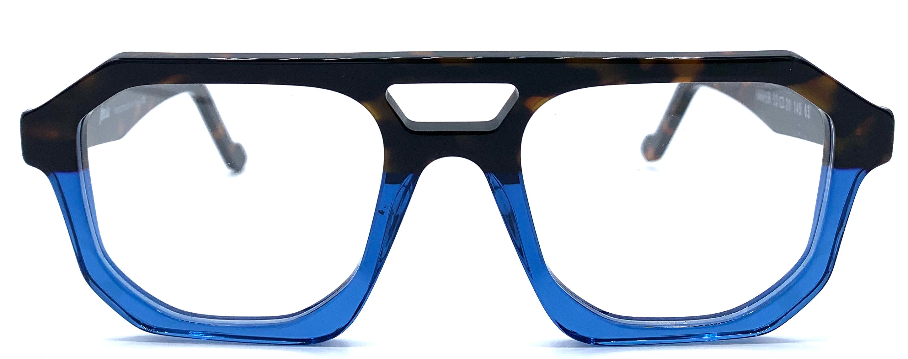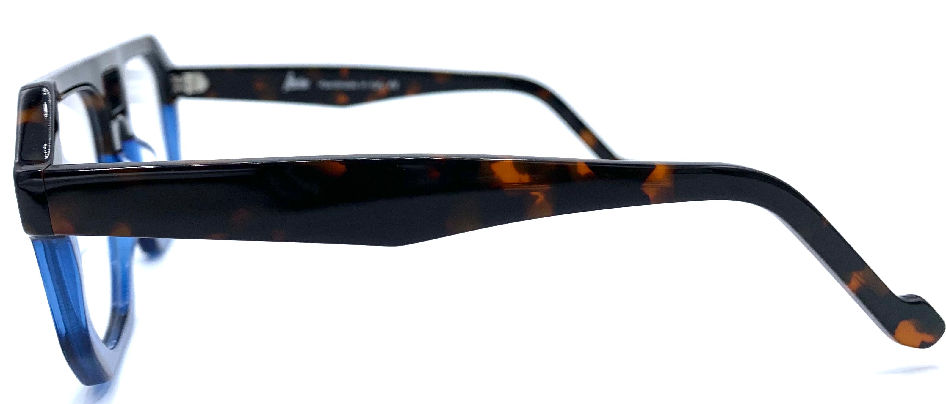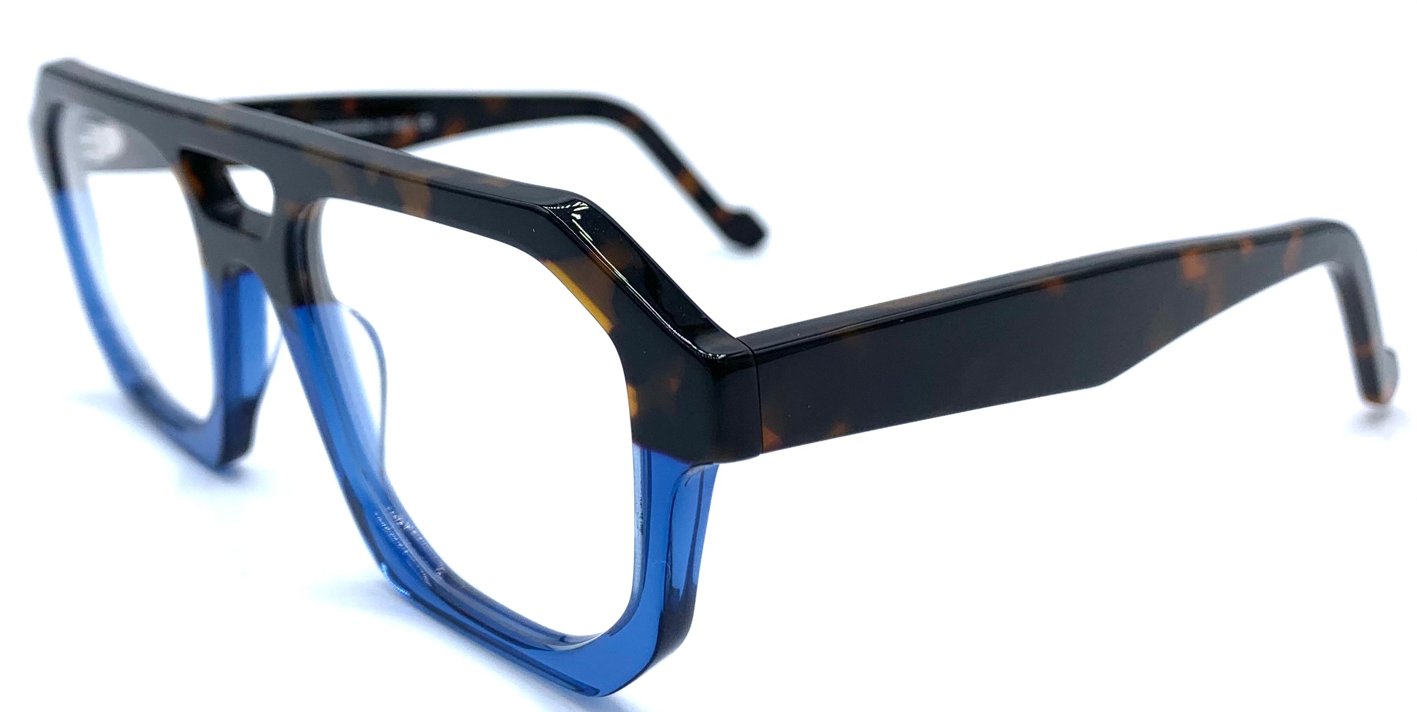 Occhiale da vista unisex in lastra bicolore avana e blu lucida cerniere affogate design iconico doppio ponte rettangolare