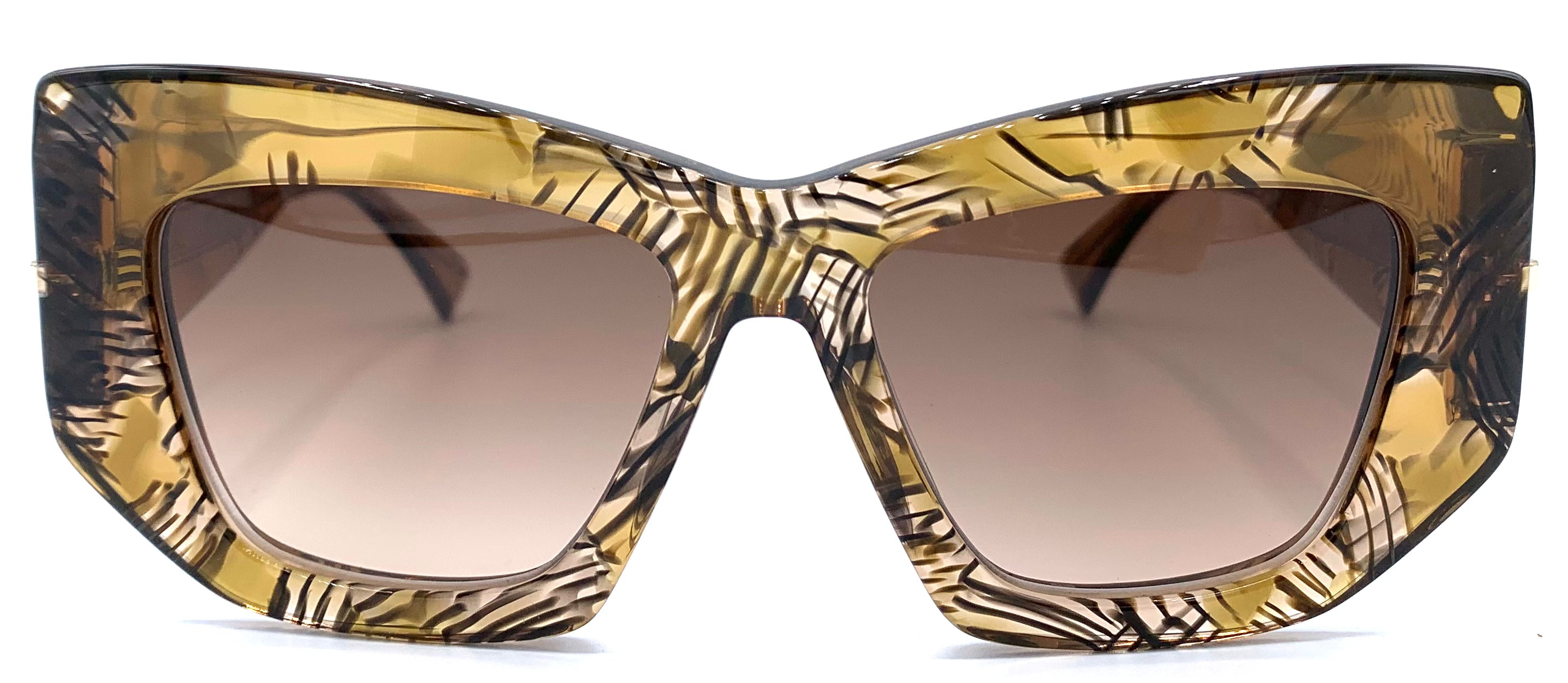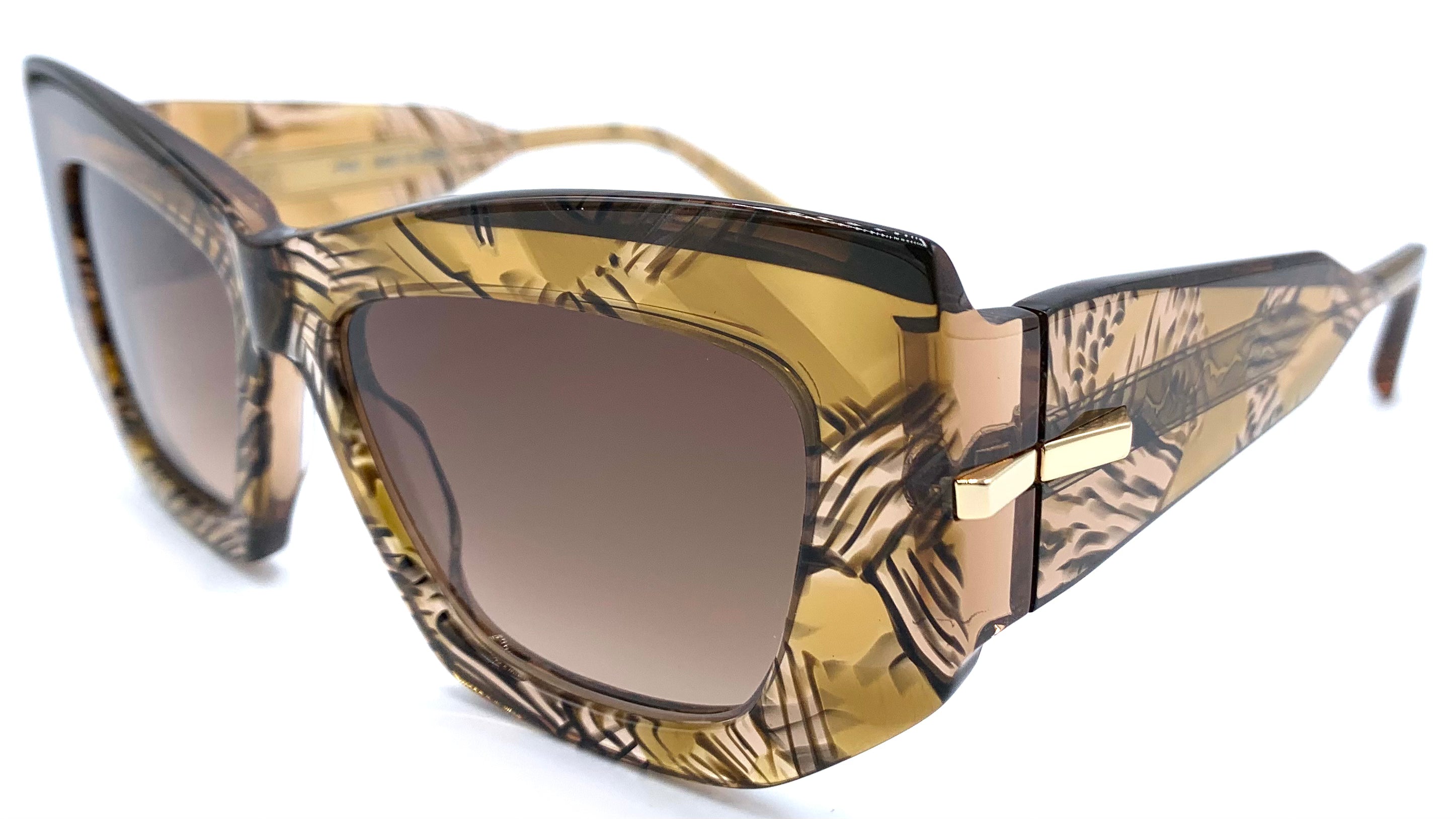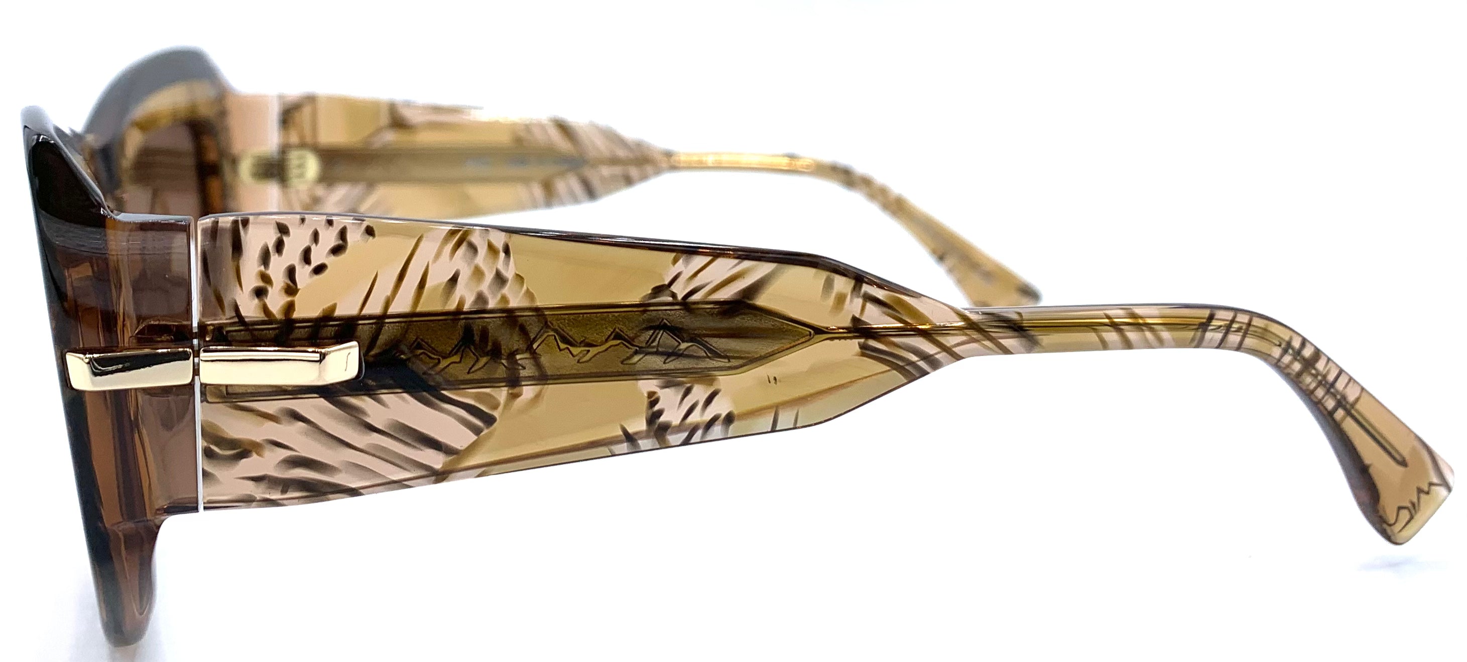 Occhiale da sole donna in lastra marrone lavorata cerniera affogata asta larga design classico elegante lenti infrangibili brawn sfumato