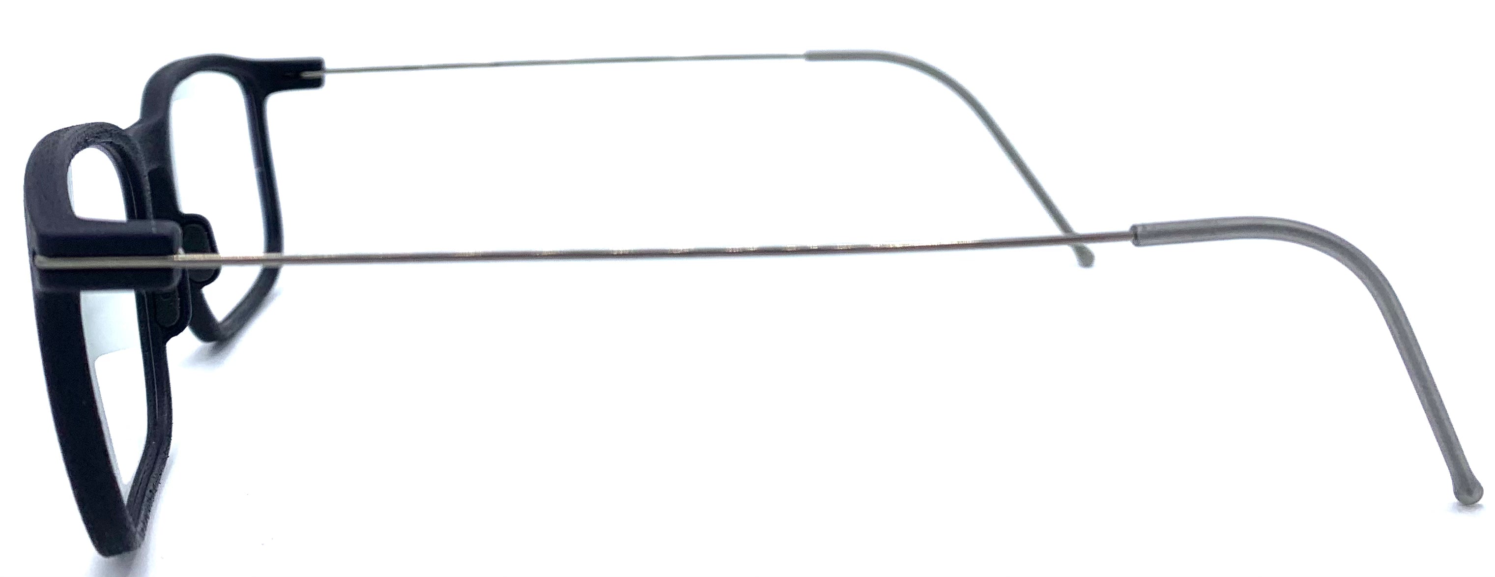 Occhiale da vista unisex in polimero stampato in 3D leggerissimo circa 4 grammi, design rettangolare Aste in titanio argento scuro si inseriscono sull’occhiale tramite un sistema di attacco innovativo senza viti. I naselli sono in silicone in tre misure come le aste di lunghezza diverse