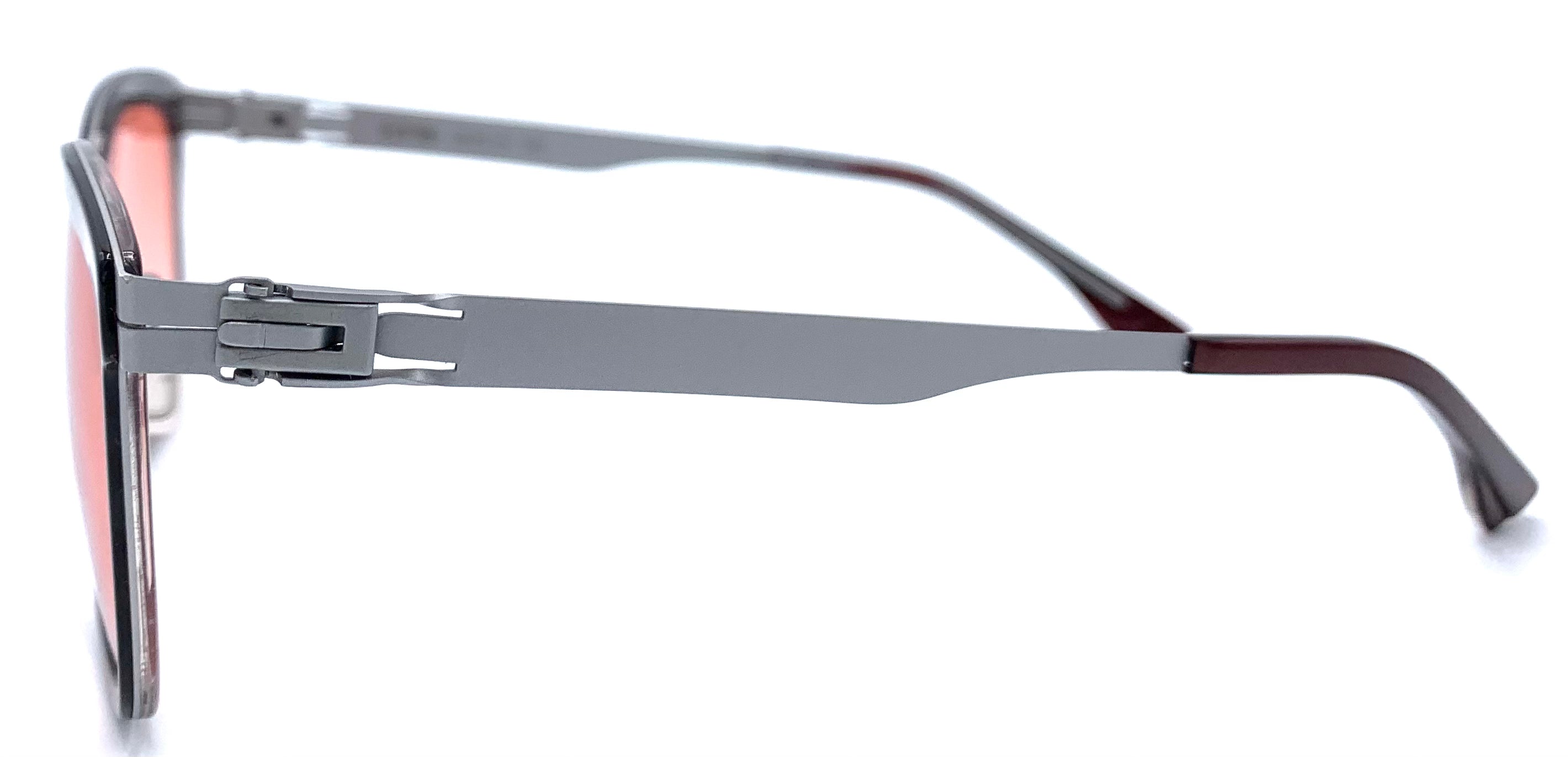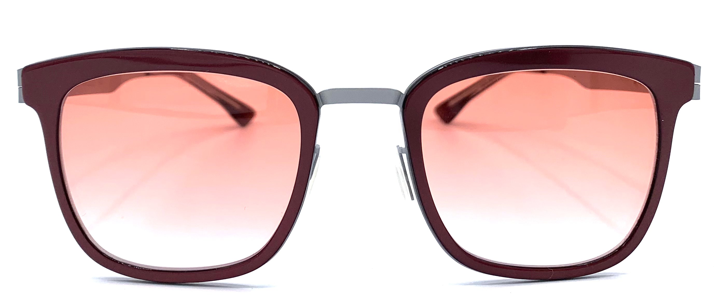 Occhiale da sole unisex in acciaio argento e cerchiaggio in lastra bordeaux lenti infrangibili bordeaux sfumato protezione uv design sagomato cerniera a fibbia senza viti leggerissimi