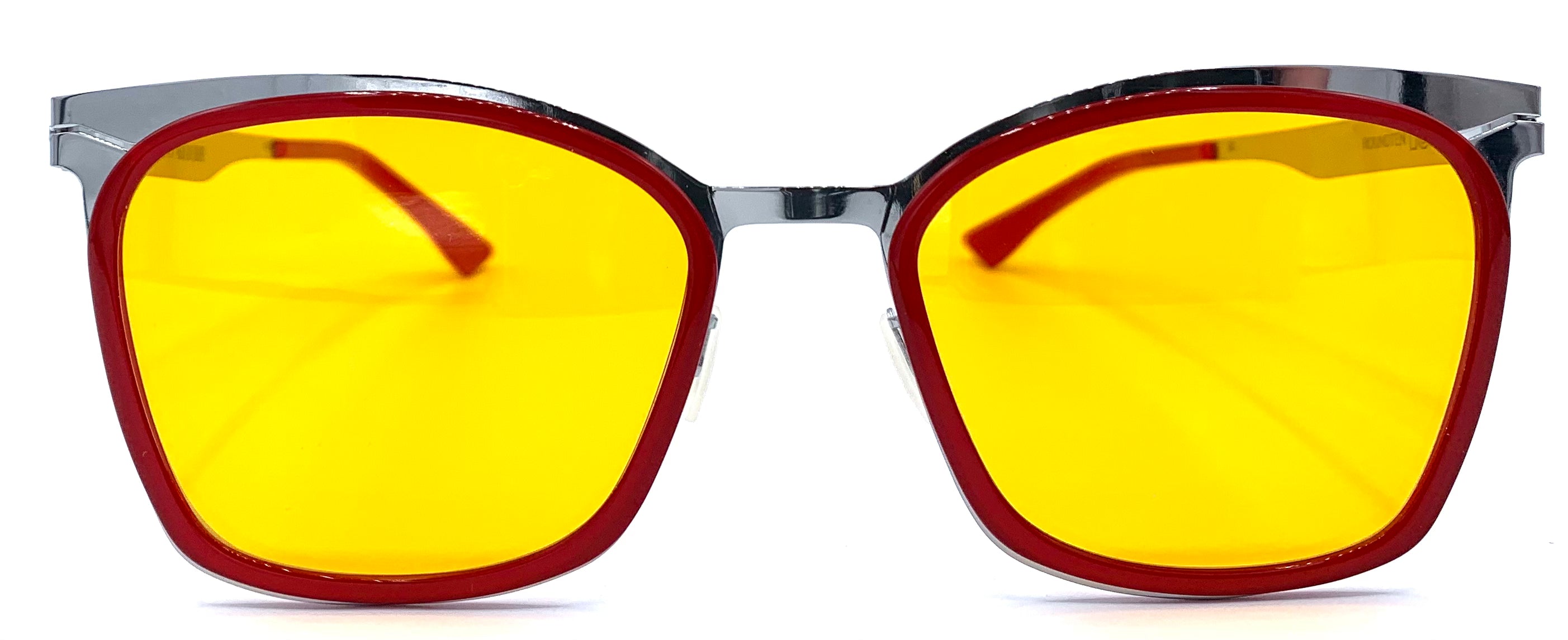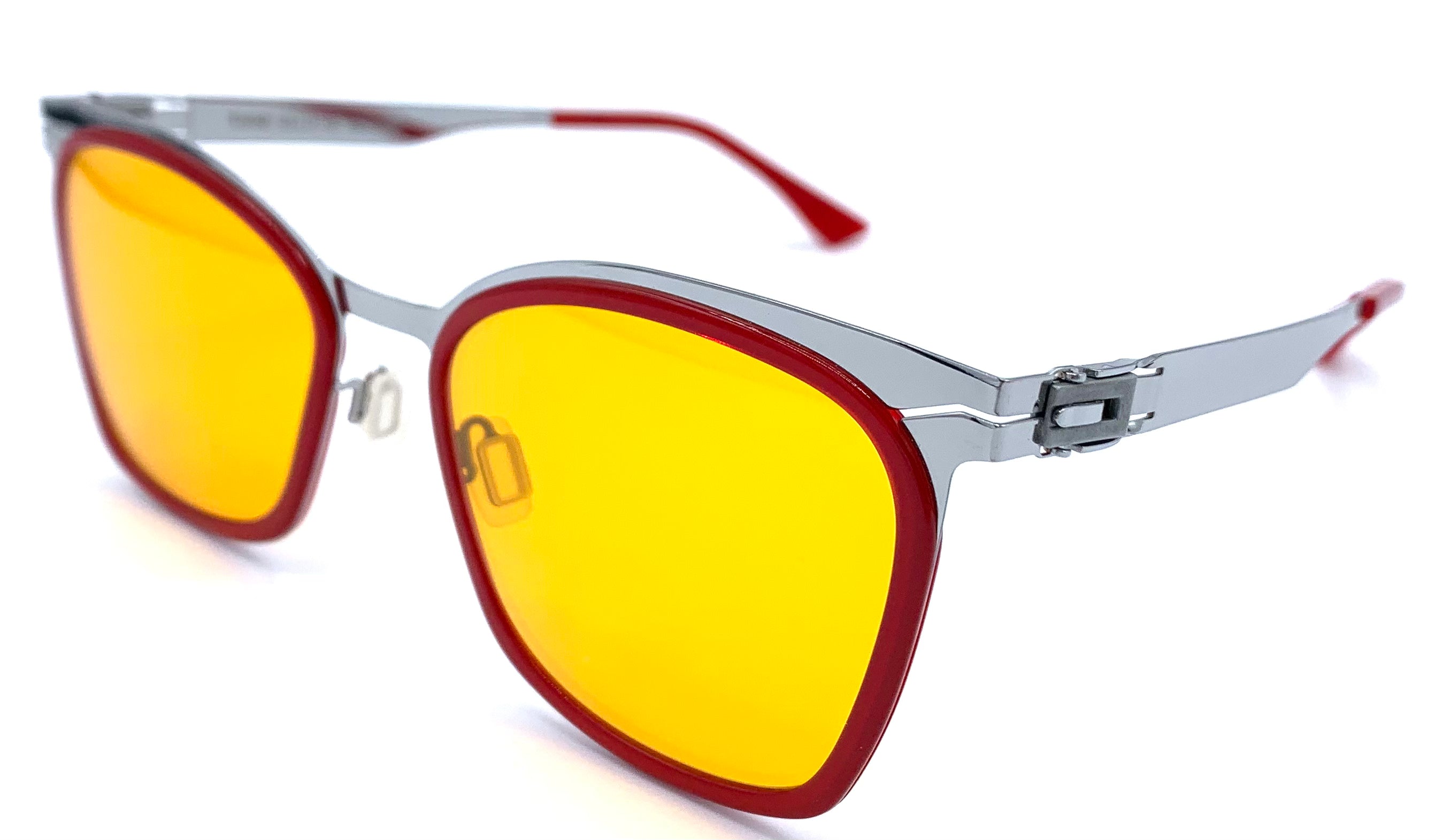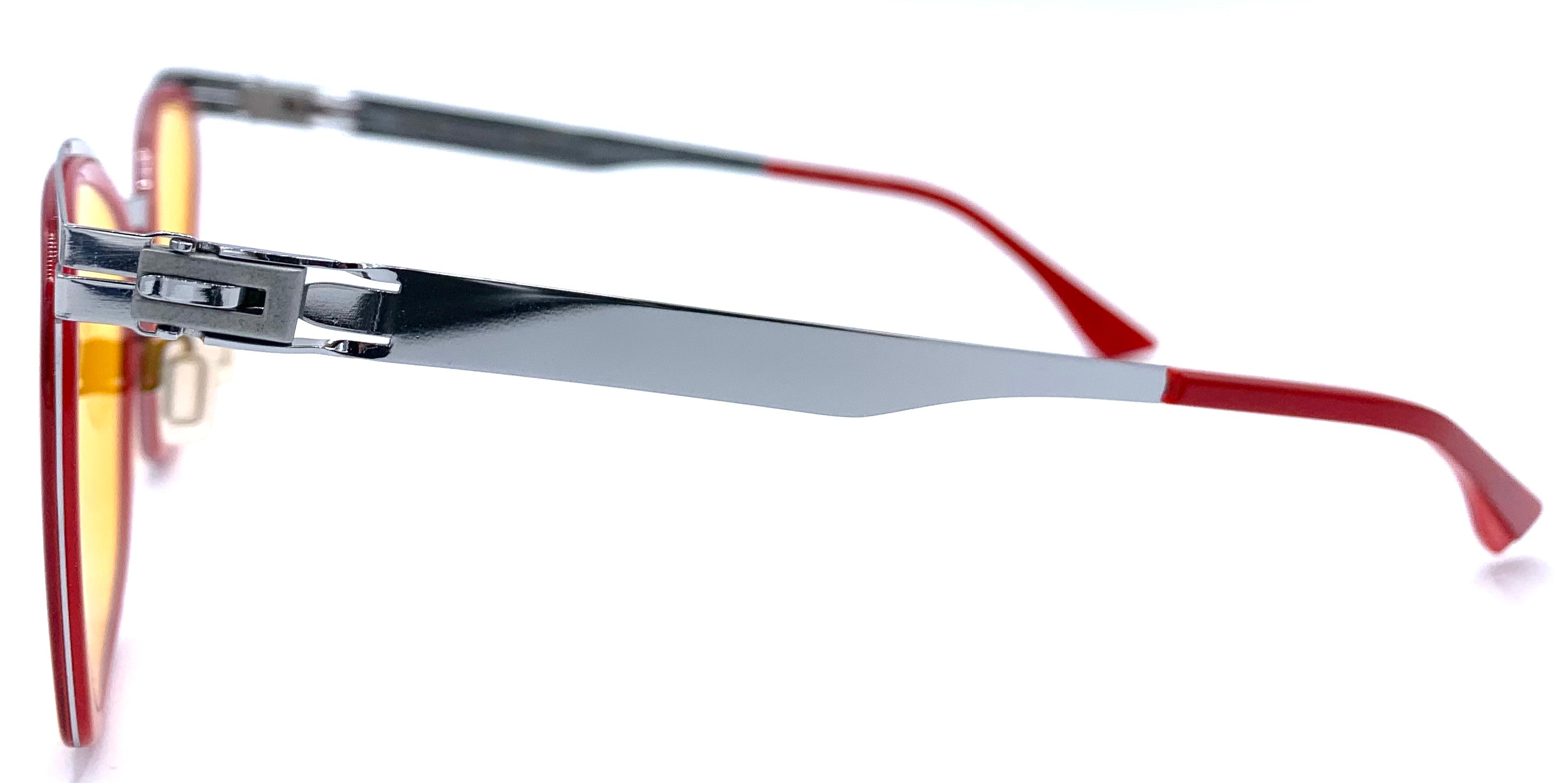 Occhiale da sole unisex in acciaio argento  e cerchiaggio in lastra rossa lenti infrangibili arancio protezione uv design sagomato cerniera a fibbia senza viti leggerissimi