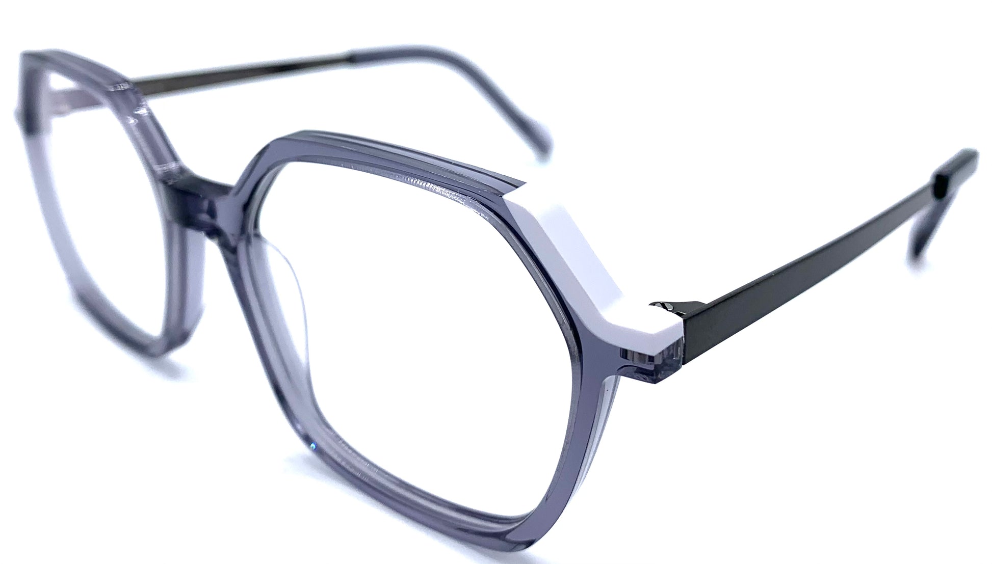 Occhiale da vista donna in lastra grigio trasparente lucida con un leggero ciliare bianco aste in acciaio nero lucido cerniere in acciaio affogate design sagomato