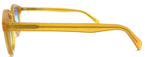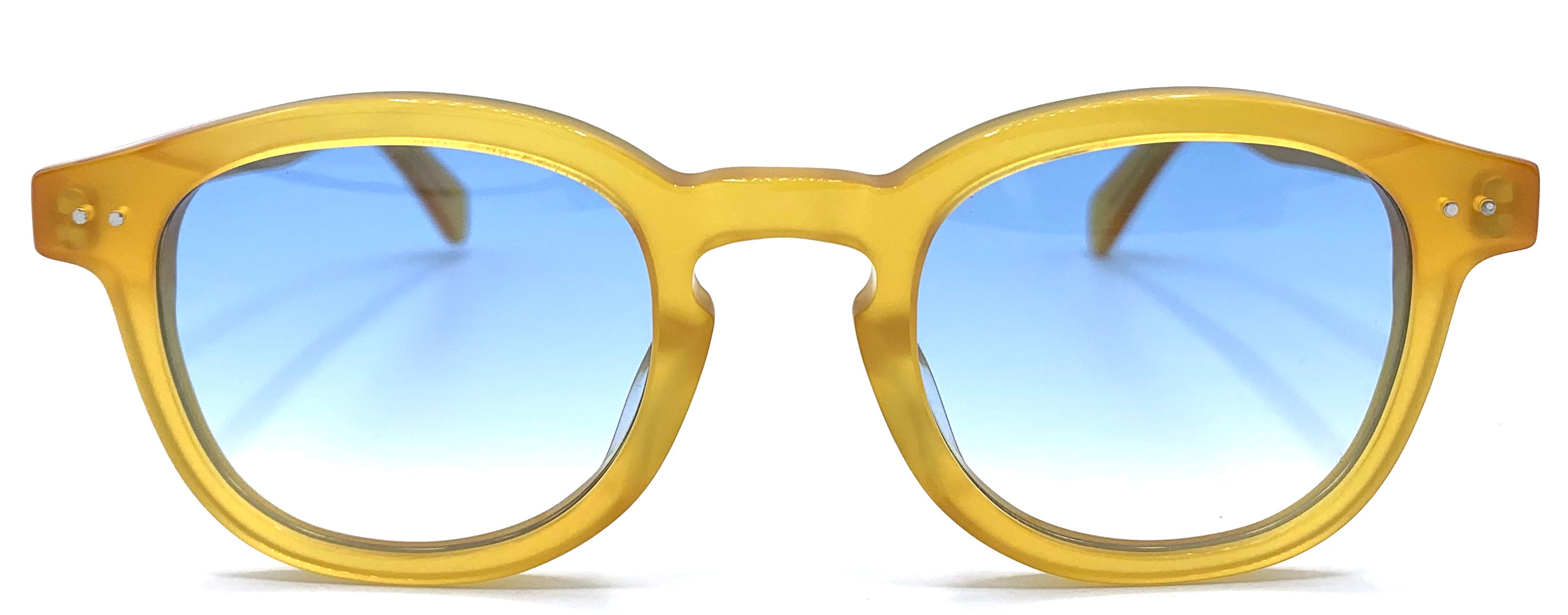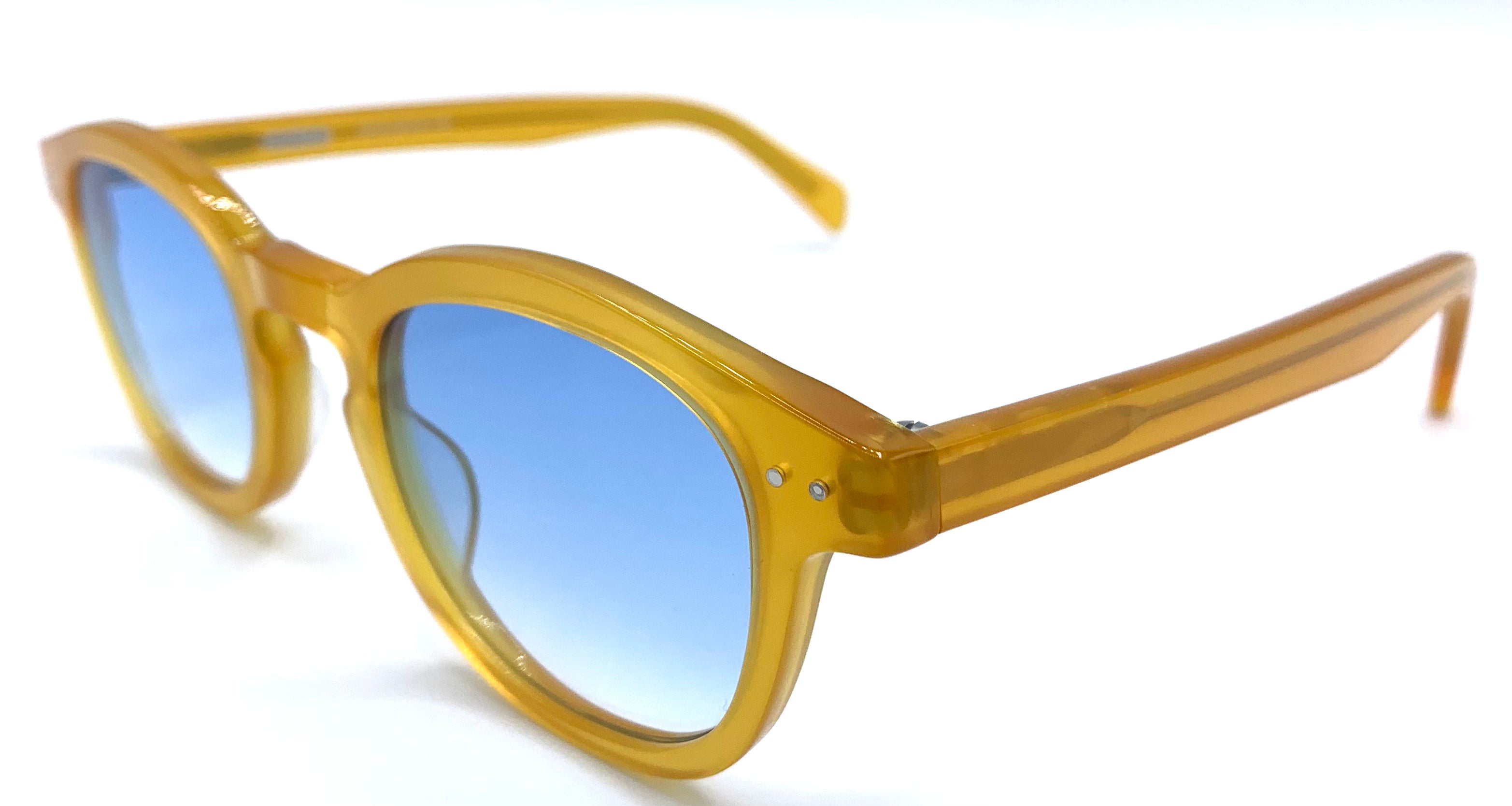 Occhiale da sole unisex in lastra miele con lenti cobalto blu sfumate protezione uv design storico pantos, queste lenti sono molto rilassanti anche di sera